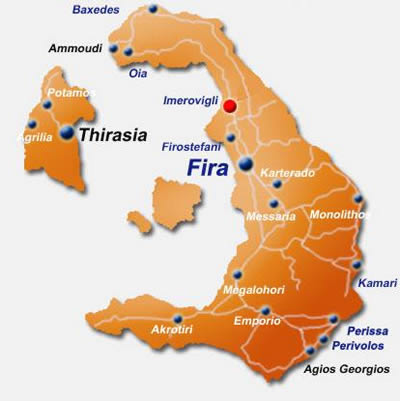 Santorini platība ir 74 km2. Līdz Pirejas ostai pie Atēnām ir 127 jūras jūdzes, līdz Krētas salai 70. Uz salas ir 13 ciemati, kas celti tradicionālā Santorini salas stilā, saglabājot gadsimtiem senas tradīcijas.